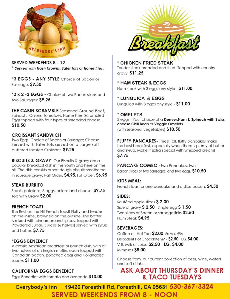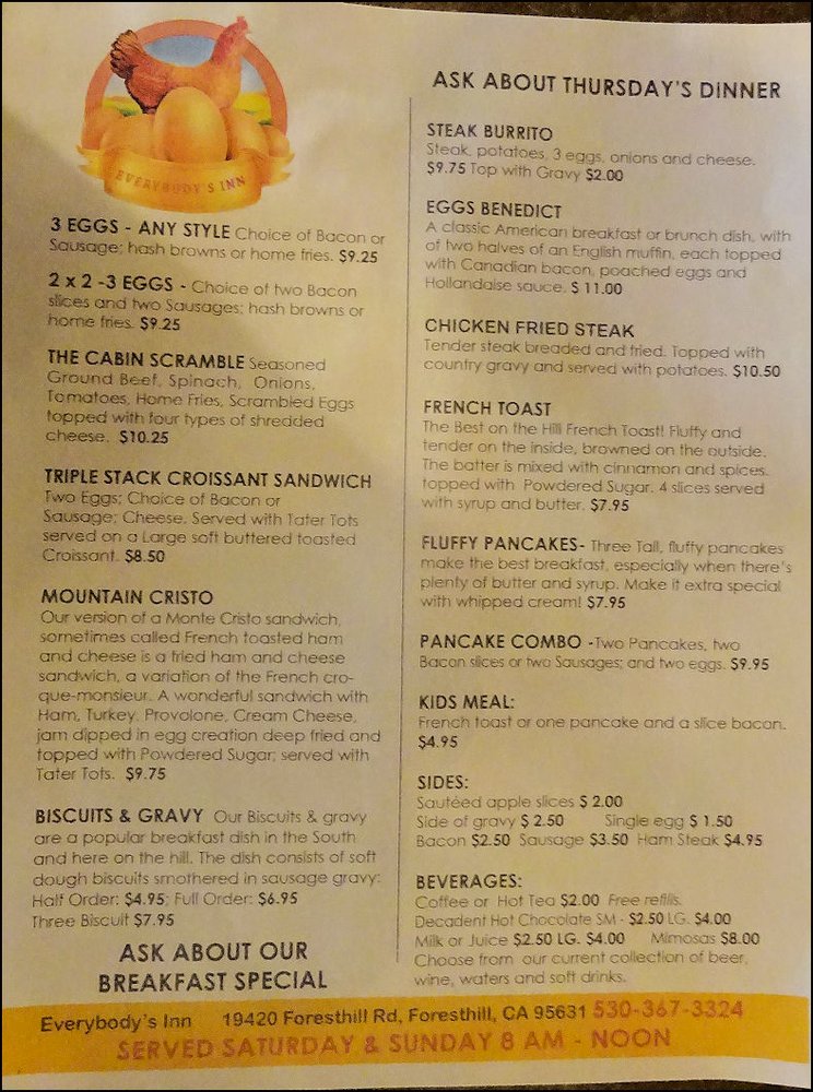 Welcome to Everybody’s Inn, the quintessential breakfast and brunch destination nestled in the heart of Foresthill, CA. This charming eatery invites you to indulge in a delightful menu that captures the essence of morning flavors in a warm, welcoming atmosphere. Located at 19420 Foresthill Rd, Everybody’s Inn isn’t just a place to eat; it's an experience that blends comfort and community.